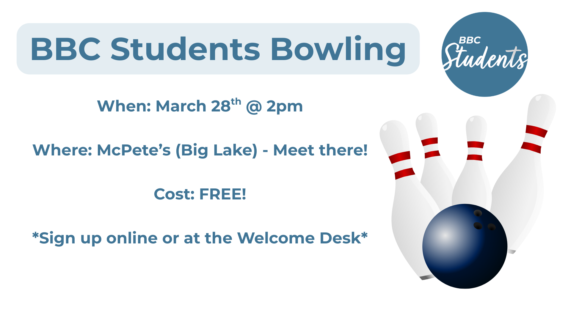 The cost of bowling and shoe rental will be fully covered. If students would like food, they will need to pay for that themselves. Also, parents/student drivers are responsible for drop-off at the bowling alley and pick-up when the event is done. If this is a challenge, please let Pastor Kale know and he will try to arrange a ride for the student. Sign up by clicking the button below. Registration for this event closes March 20th. The annual permission slip (see below) must be completed & submitted before this event, if it has not already been completed & submitted.